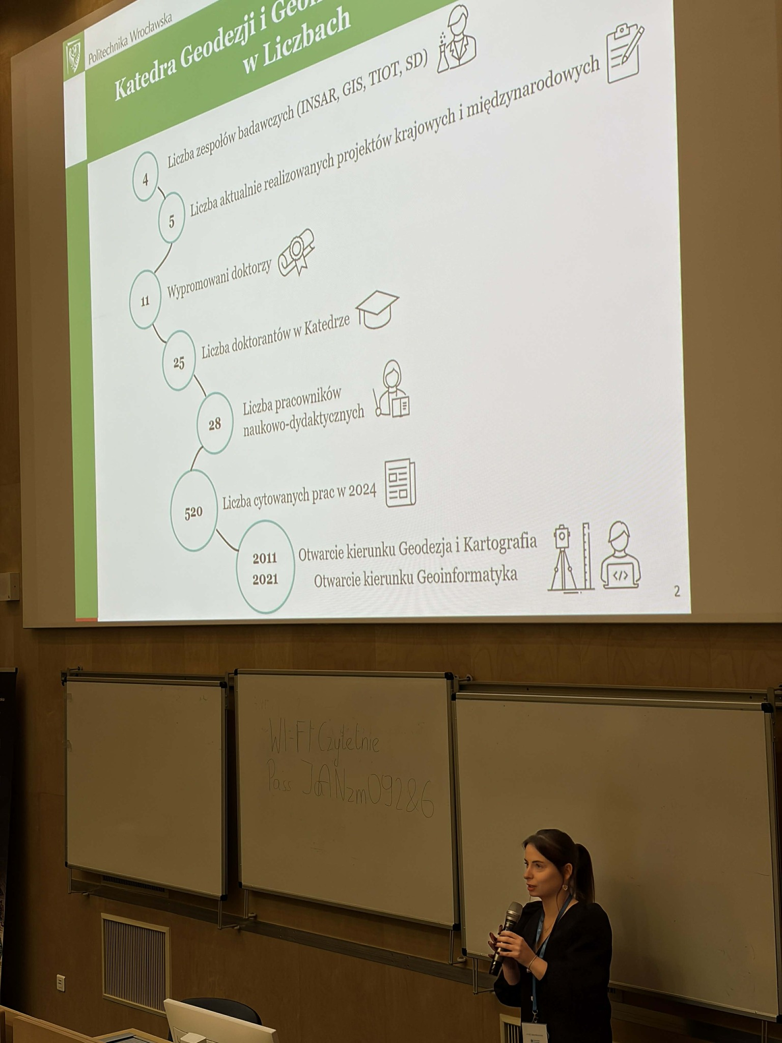 Szczególne brawa należą się naszej reprezentantce, dr inż. Annie Buczyńskiej, która w interesujący sposób przedstawiła działalność Katedry Geodezji i Geoinformatyki PWr, poruszając m.in. temat wykorzystania GIS w badaniach naukowych pracowników Katedry i pracach dyplomowych jej studentów.