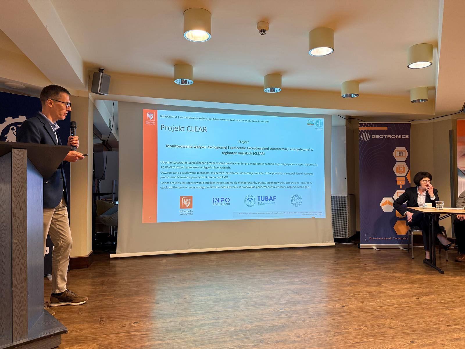 Jan Blahofsky omówił "Możliwości i ograniczenia satelitarnego monitoringu obszarów podziemnego magazynowania gazu" na podstawie wyników uzyskanych w projekcie pt. "Monitorowanie wpływu ekologicznej i społecznie akceptowalnej transformacji energetycznej w regionach wiejskich (CLEAR)". Projekt jest finansowany przez