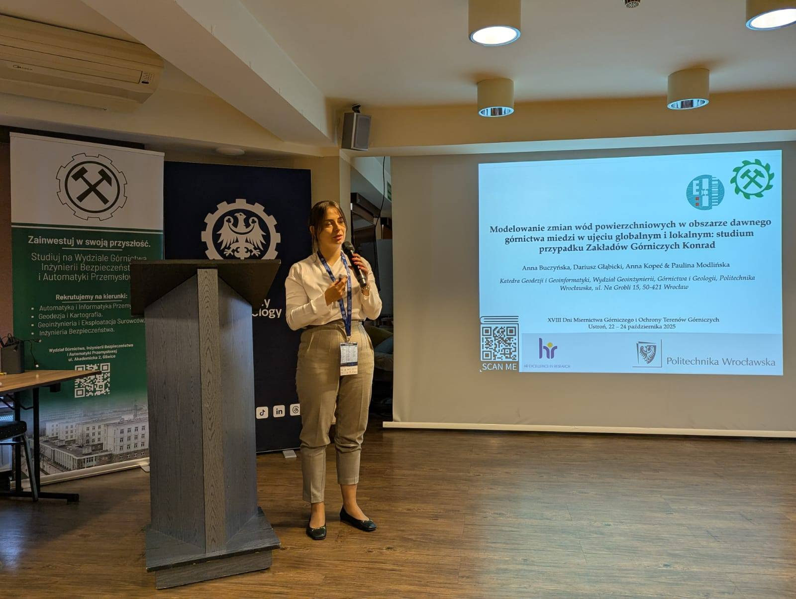 Dr inż. Ania Buczyńska przedstawiła wyniki "Modelowania zmian wód powierzchniowych w obszarze dawnego górnictwa miedzi w ujęciu globalnym i lokalnym: studium przypadku Zakładów Górniczych Konrad". Pełne rezultaty tych badań znajdują się w publikacji